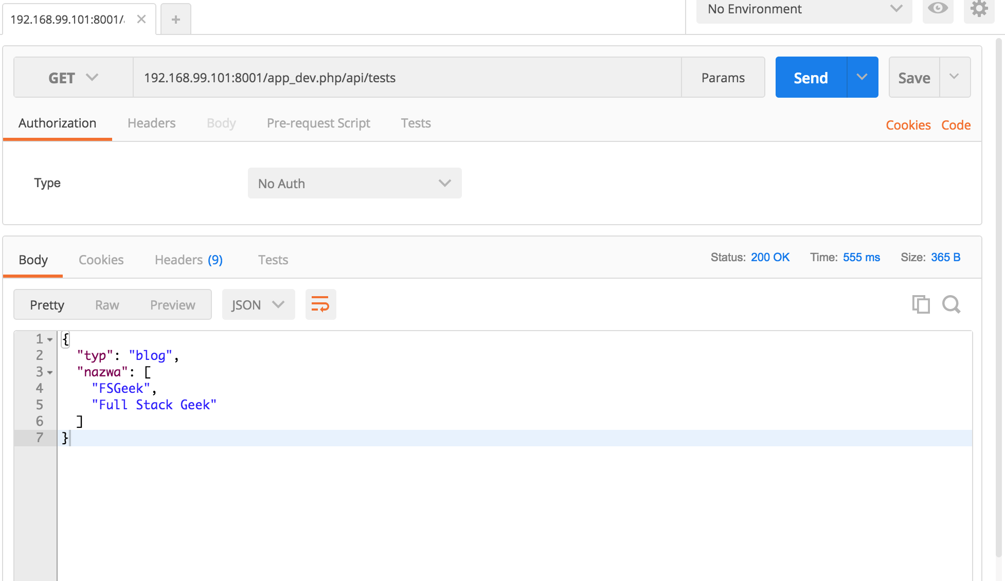 I ten adres wpiszę do Postmana , wybiorę metodę GET i wyślę zapytanie. Na poniższym zrzucie widać efekt tego zapytania jeśli wszytsko działa.