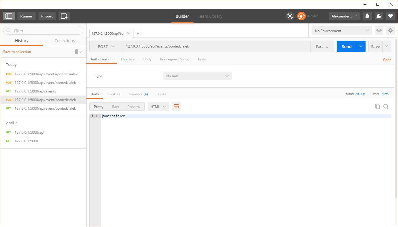 Jak widać nie jest to ciężkie. Python pozwala bardzo szybko stworzyć podstawowy serwer API, który zwraca wartości, które chcemy. Nic nie stoi na przeszkodzie by teraz zamiast zwykłych tekstów zwracać JSONa.  Teraz będę chciał przepisać istniejący kod na Flask_RESTful na którego natknąłem się ostatnio. Potem będę się łączył z bazą danych i wtedy nasze ścieżki będą już w pełni funkcjonalne. Tak więc do usłyszenia wkrótce.