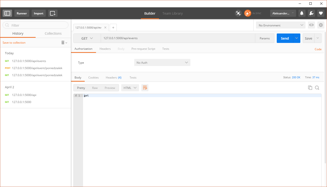 Mając tą podstawową wiedzę można budować już ścieżki w Pythonie. Aby wszystko było w miarę ładnie poukładane to wstawię je do nowego pliku events.py w folderze routes. Pierwszą ścieżką będzie ta która pozwoli pobrać wszystkie rekordy.